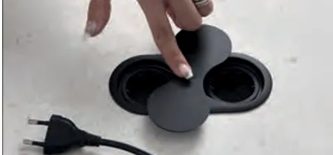 Durch Druck auf den zentralen Knopf lässt sich das Oberteil (Abdeckung) der Energiebox drehen und die darunter liegenden beiden Steckdosen kommen betriebsbereit zum Vorschein.