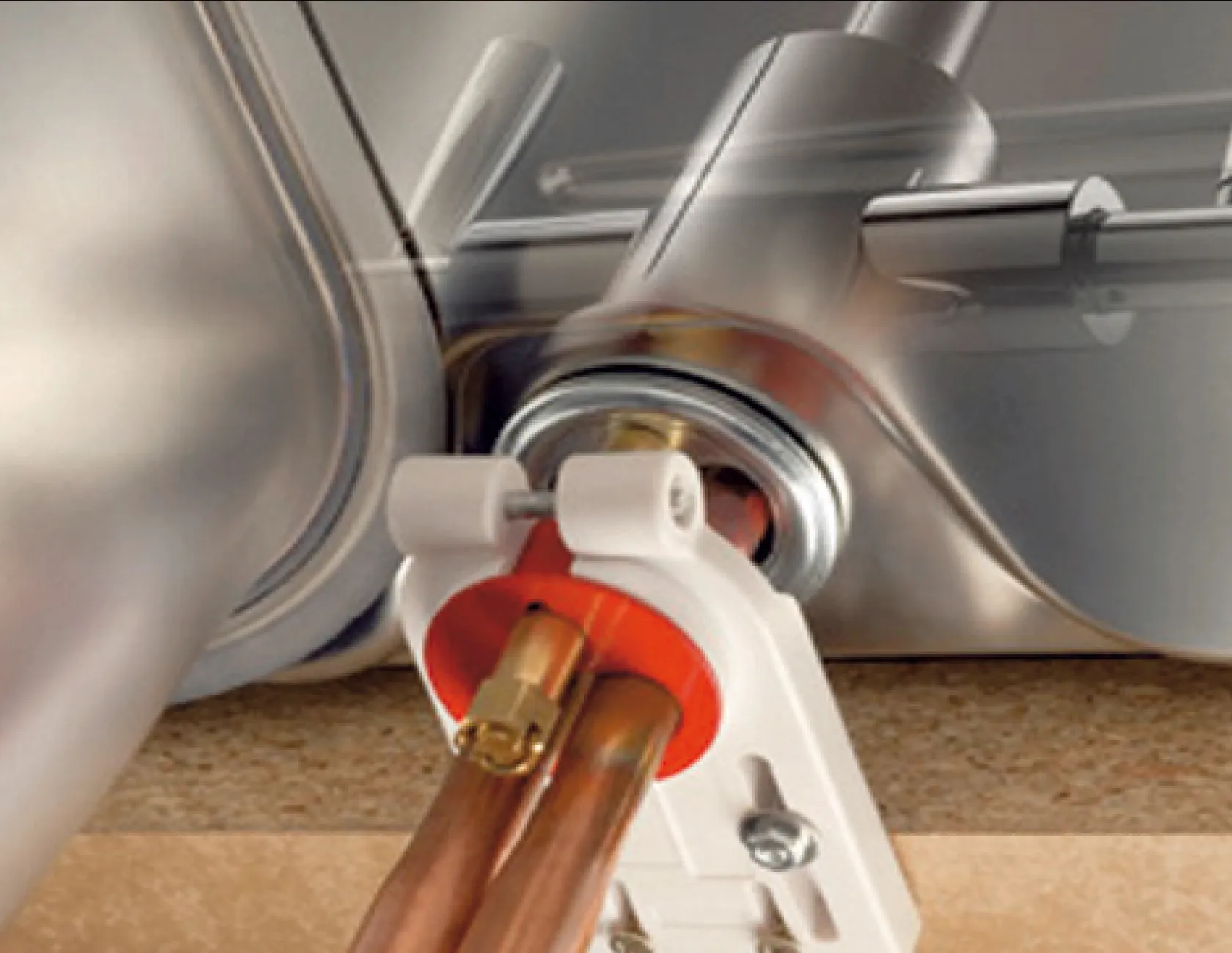 Für festen Sitz der Armatur durch Verbindung mit der Arbeitsplatte. Fixiert die Armatur nochmal unterhalb der Spüle und bildet eine Brücke zur Arbeitsplatte.
