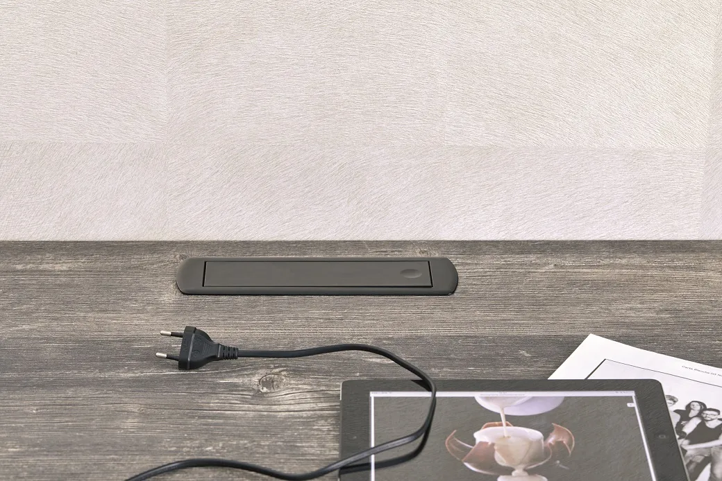 Die Cizo-Energiebox fährt auf Fingerdruck automatisch einseitig und über eine Achse nach oben aus der Arbeitsplatte heraus und gibt zwei Schutzkontakt-Steckdosen sowie 2 USB-Anschlüsse frei.