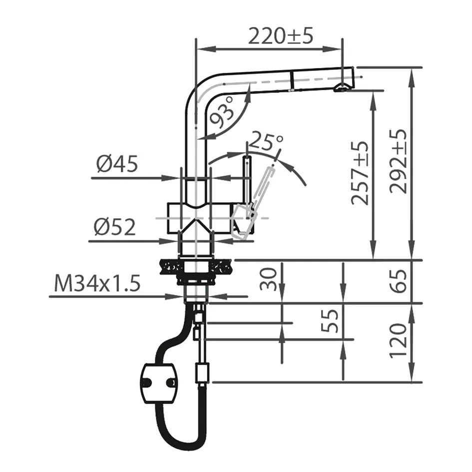Mit herausziehbarem Auslauf. Anwendbar bei nach innen schwingenden Fenster, da die Armatur flach hingelegt werden kann. Höhe gekippt: 60mm. Wassersparend, mit Kaltstart.