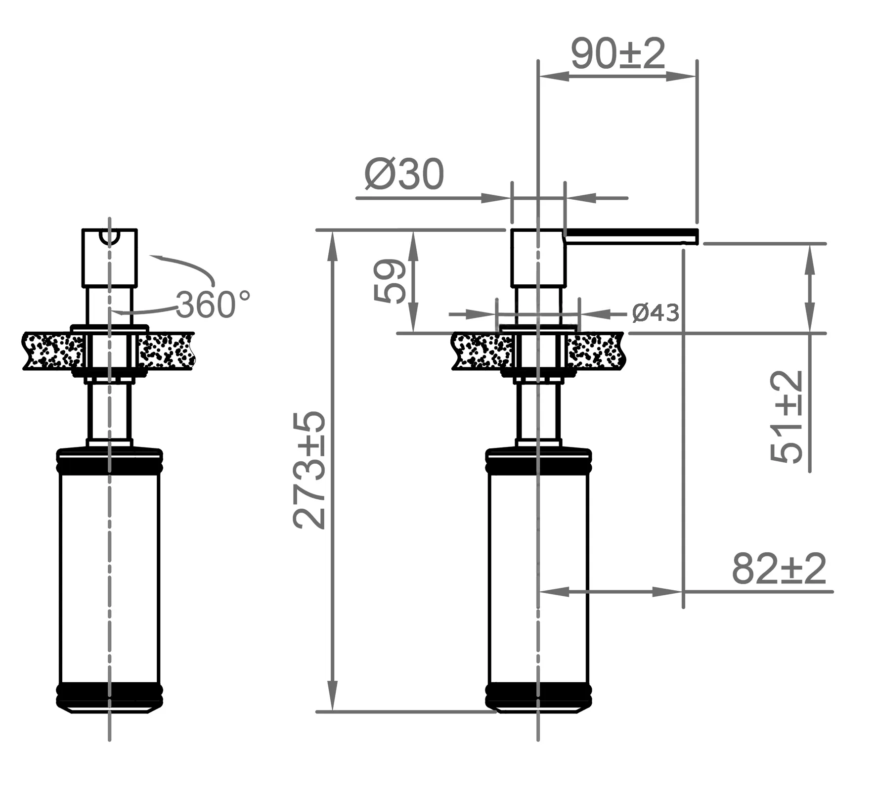 Spülmittelspender mit Kunststofff Pumpe. Maximale Stärke der Arbeitsplatte 50mm.