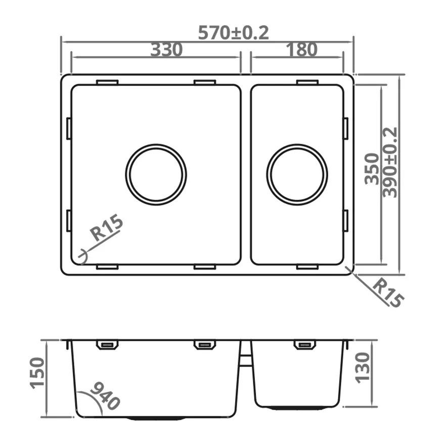 Basic Line. Edelstahl, Tiefe 150+130mm, inkl. Korbventil-Set mit Design-Überlauf und Klemmen. Aufgrund der begrenzten Einbautiefe von 350mm bleibt hinter der Spüle mehr Platz, was die installation einer Armatur erleichtert. Abmessungen (BxT): innen: 330/180x350mm, Außen: 570x390mm.