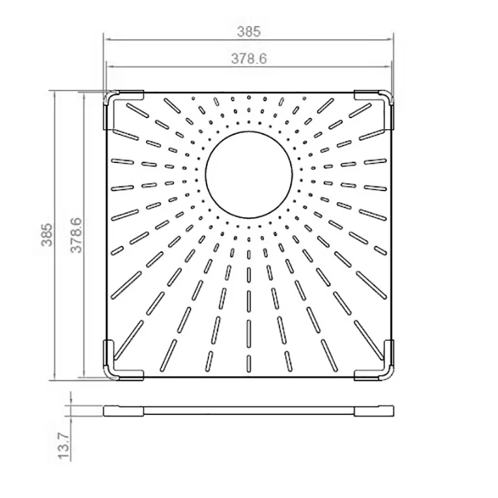 Bodengitter aus Edelstahl im "Sunbeam"-Design. Zum Schutz des Behälterbodens. Abmessungen (LxBxH): 390x390x14mm. Für die 400x400mm Gun Metal R-serie, Artikel 708024/708033.