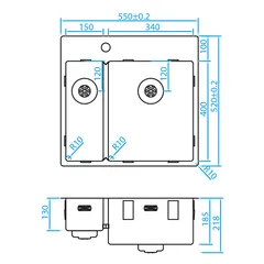Spüle in hoher Materialstärke, inkl. Korbventil-Set mit Design-Überlauf und Klemmen.
