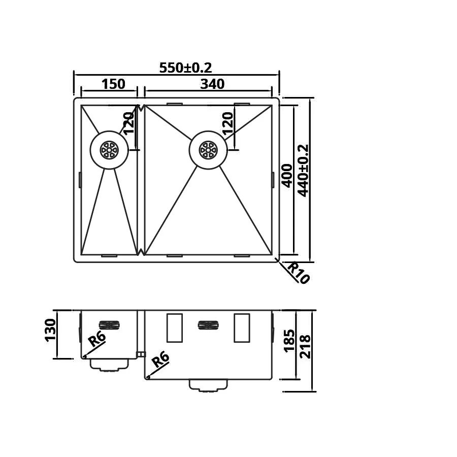 Edelstahl, Tiefe 130+185mm, Radius auswendig: R0, Radius im Boden R6, inkl. Korbventil mit Design-Überlauf und Klemmen, Abmessunge (BxT): innen 150/340x400mm, Außen: 550x440mm.