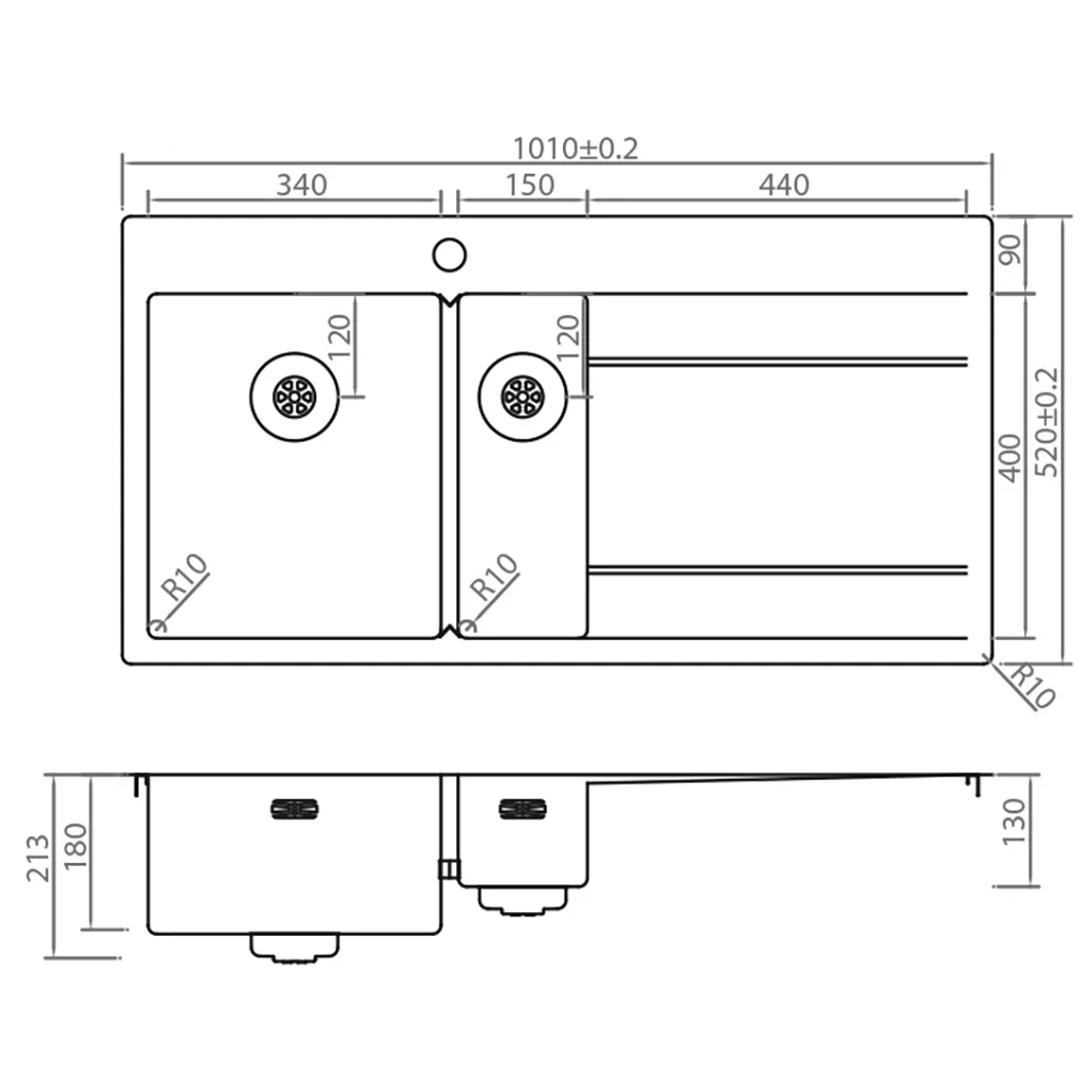 Großes Becken links. Edelstahl, Tiefe 185+130mm, inkl. Korbventil-Set mit Design-Überlauf und Klemmen. Zusätzliches (Hahn-)Loch: 59,00 €. Abmessungen (BxT): innen: 340/150x400mm, Außen: 1010x520mm.