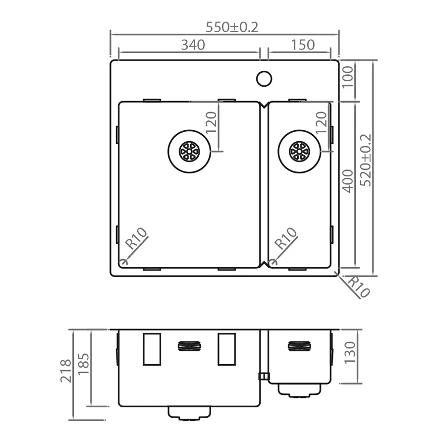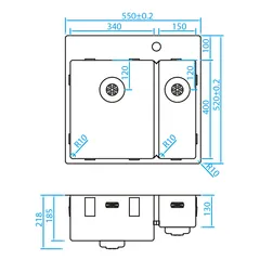 Eigenschaften "CARESSI CAPP3415KR10, Spüle mit Restebecken und Hahnbank, ab 60er Schrank, Edelstahl massiv, Becken links"