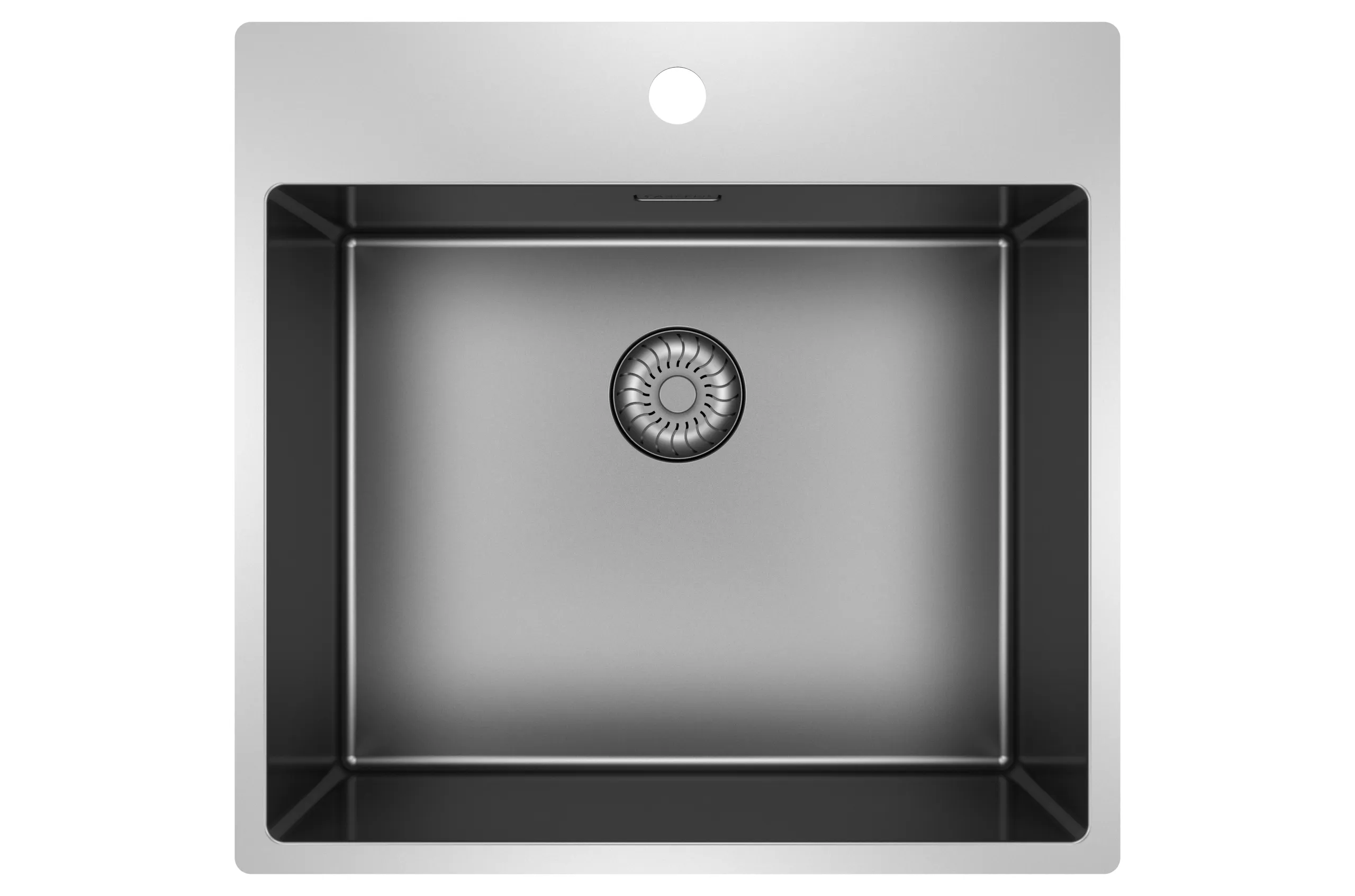 Edelstahl, Tiefe 185mm, inkl. Korbventil-Set mit Design-Überlauf und Klemmen. Die Farbe Gun Metal (Schicht) ist kratzempfindlich. Seien Sie vorsichtig mit harten/spitzen Gegenständen und scheuernden Reinigungsmitteln. Tipp: Verwenden Sie ein unteres (Schutz-)Bodengitter. Zusätzliches (Hahn-)Loch: 50,00 €. Abmessungen (BxT): innen: 500x400mm, Außen: 540x520mm.