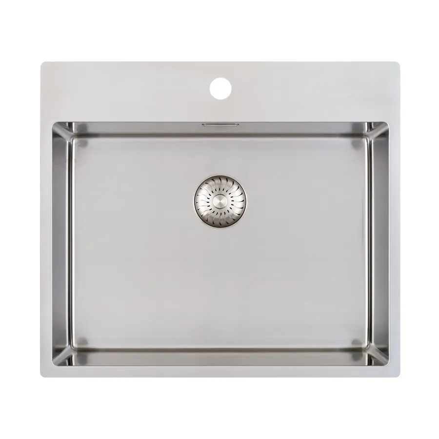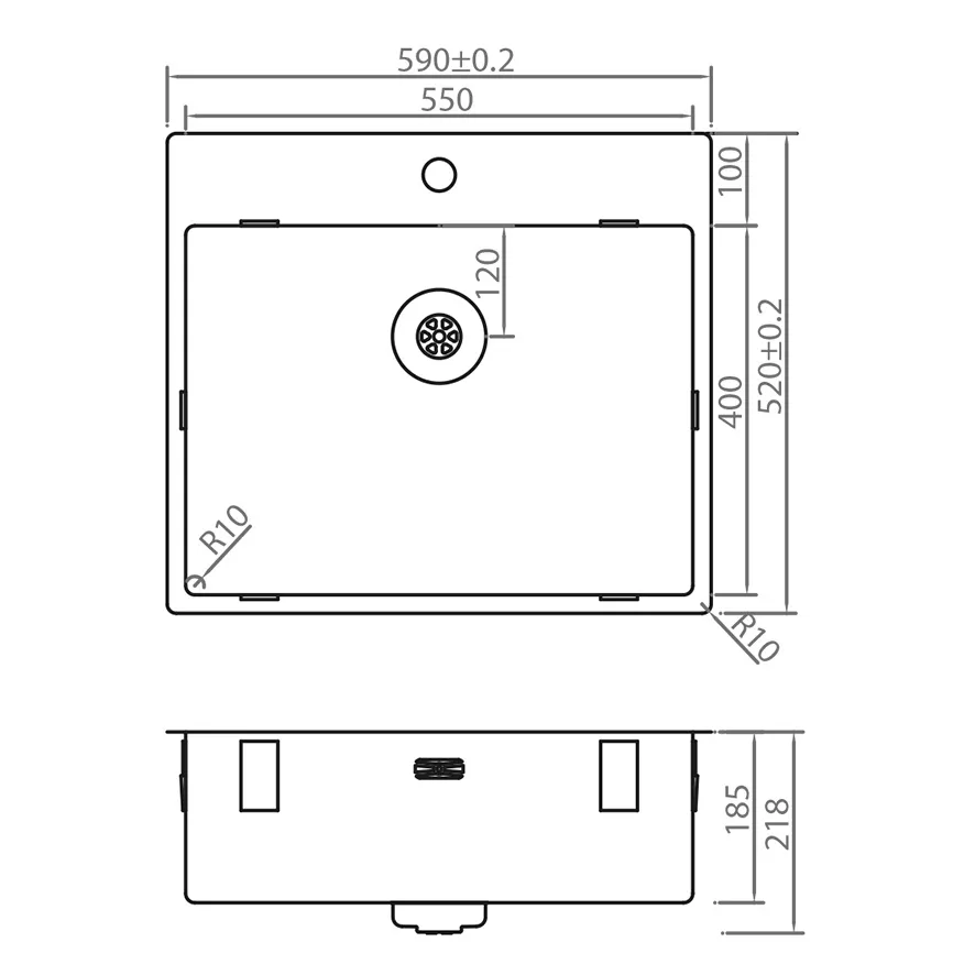 Edelstahl, Tiefe 185mm, inkl. Korbventil-Set mit Design-Überlauf und Klemmen. Zusätzliches (Hahn-)Loch: 59,00 €. Abmessungen (BxT) innen: 550x400mm, Außen: 590x520mm.