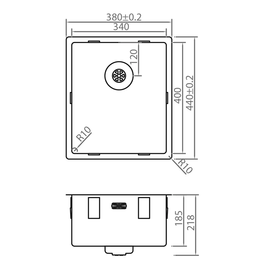 Edelstahl, Tiefe 185mm, inkl. Korbventil-Set mit Design-Überlauf und Klemmen. Abmessungen (BxT) innen: 340x400mm, Außen: 380x440mm.