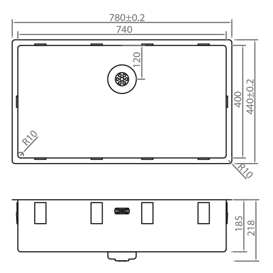 Edelstahl, Tiefe 185mm, inkl. Korbventil-Set mit Design-Überlauf und Klemmen. Abmessungen (BxT) innen: 740x400mm, Außen: 780x440mm.