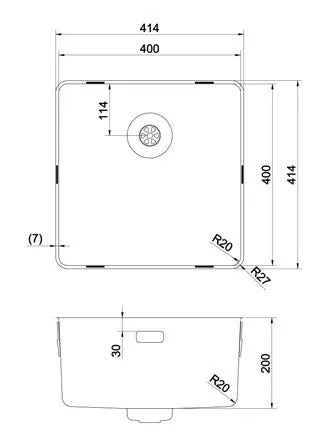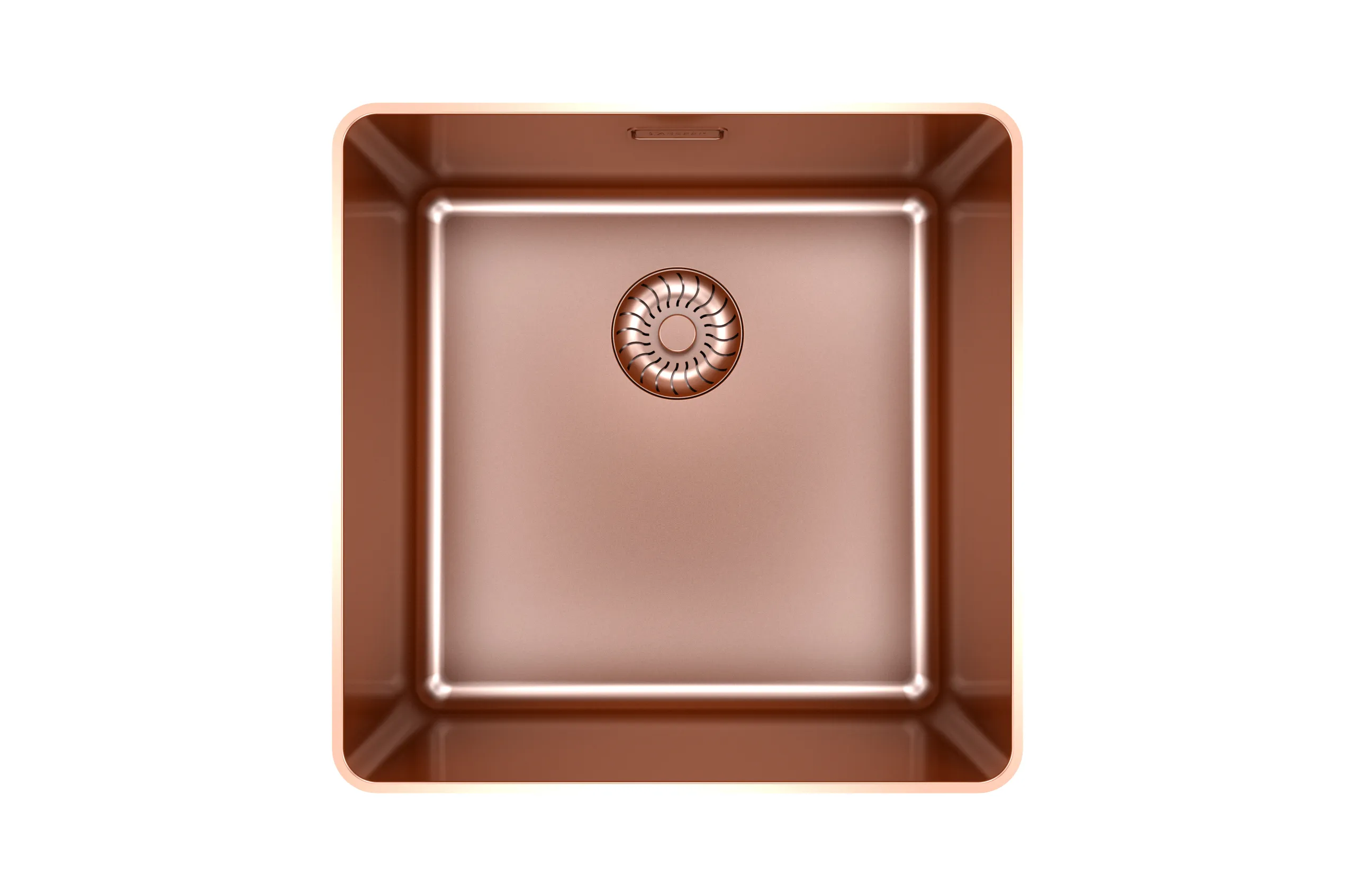 Edelstahl mit Schmalem Montagerand. Tiefe 200mm, inkl. Korbventil-Set mit Design-Überlauf und Klemmen. Die Farbe Copper (Schicht) ist kratzempfindlich. Seien Sie vorsichtig mit harten/spitzen Gegenständen und scheuernden Reinigungsmitteln. Tipp: Verwenden Sie ein unteres (Schutz-)Bodengitter. Abmessungen (BxT) innen: 400x400, Außen (schmalem rand): 414x414mm.