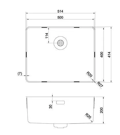 Edelstahl mit Schmalem Montagerand. Tiefe 200mm, inkl. Korbventil-Set mit Design-Überlauf und Klemmen. Abmessungen (BxT) innen: 500x400, Außen (schmalem rand): 514x414mm.