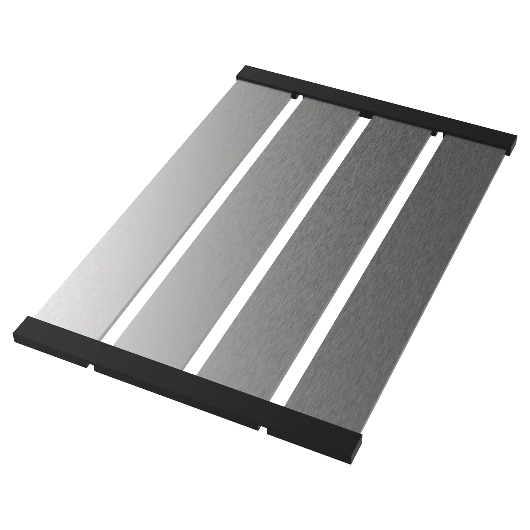 Faltbar, Aluminium mit Schwarze Silikonrand. Abmessungen (LxBxH): 450x380x5mm.