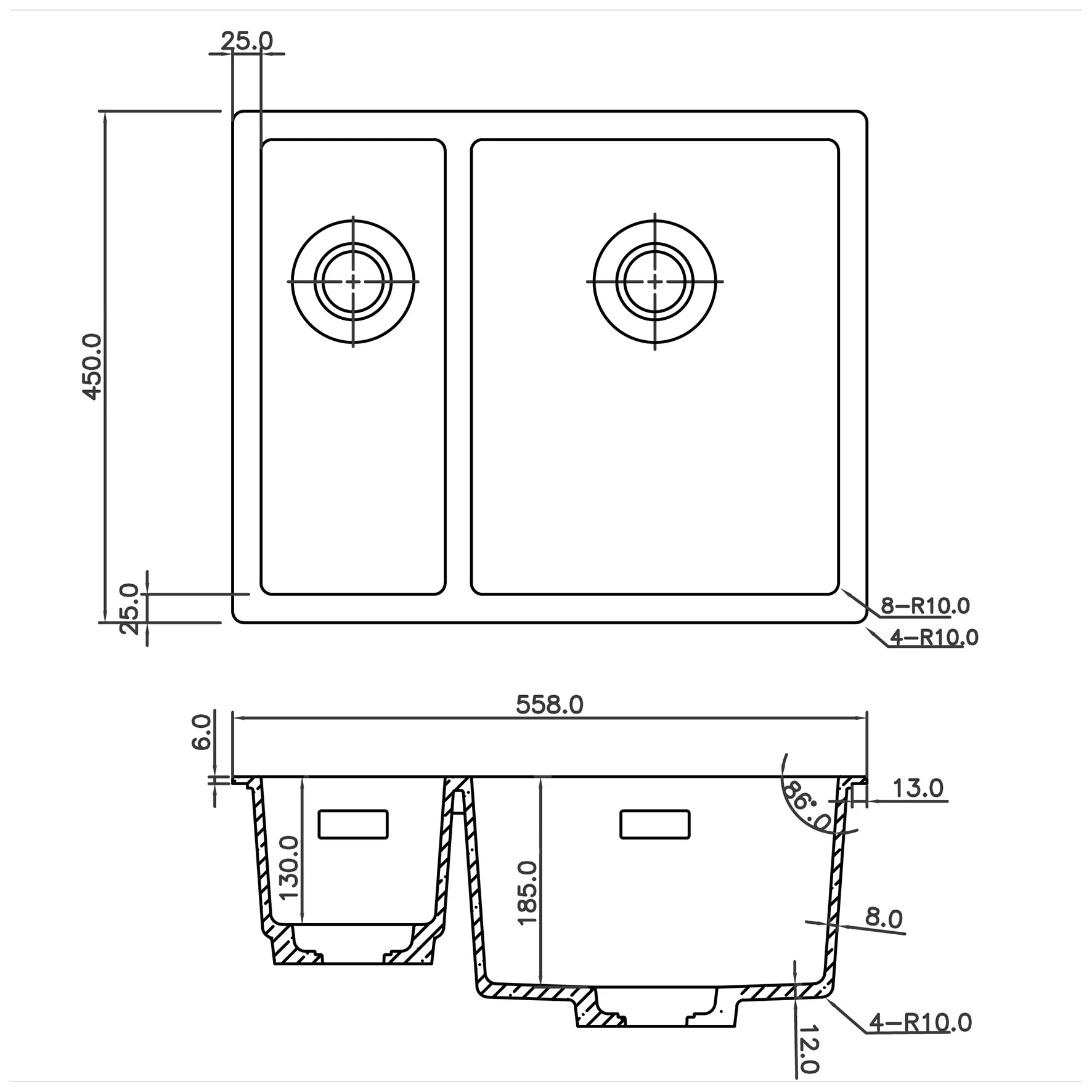 CARESSi Black Line Doppelbecken-Spüle 558mmbreit