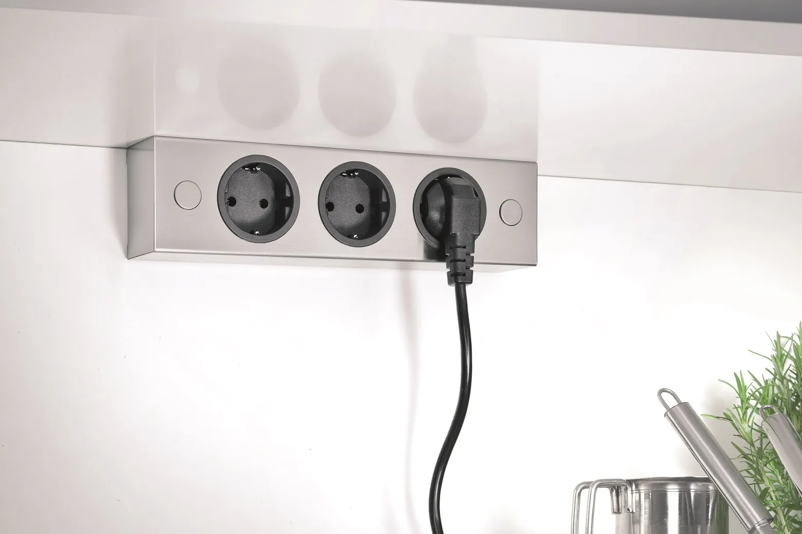 Kompakte 3-fach Steckdosen-Box für verschiedenste Planungsvarianten bis hin zur Verwendung auf der Arbeitsplatte und zwischen WAP.