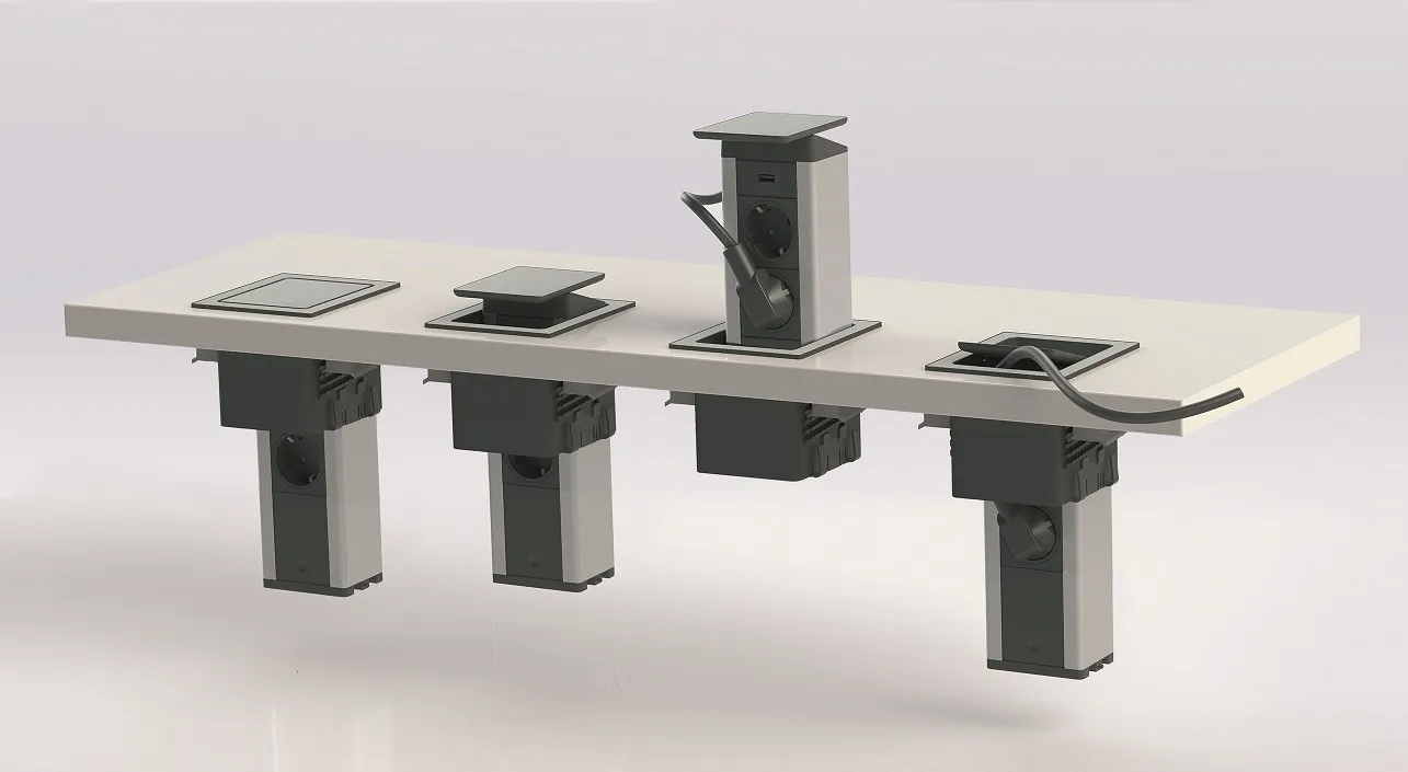 Für flächenbündigen Einbau Ausfräs-Maß anfordern. Entweder mit 3 oder 2 Steckdosen und USB-Anschluss, inkl. eingebautem Ladegerät (5V/2500mA) lieferbar.