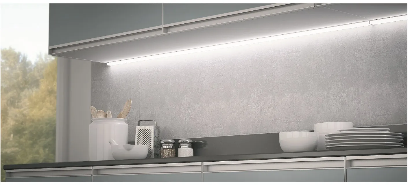 Die Befestigung mit Spezialclips außerhalb des Sichtbereiches ist so clever gelöst, dass nach unten überstehende Seitenteile von Schränken technisch überbrückt werden, ohne die Gesamtwirkung der Leuchte bzw. der Planung zu beeinträchtigen. Es können mehrere Leuchten an einen Converter angeschlossen werden (Watt in Summe beachten).