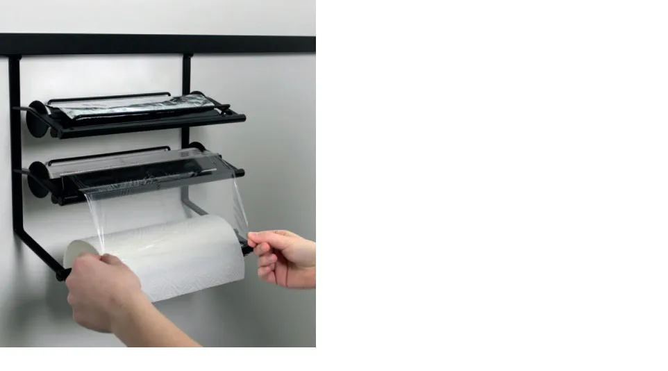 Rollenhalter mit cleverer Schneide-Vorrichtung, der 3 wichtige Rollen (Papier, Alufolie und Frischhaltefolie) für den Haushalt aufnehmen kann.