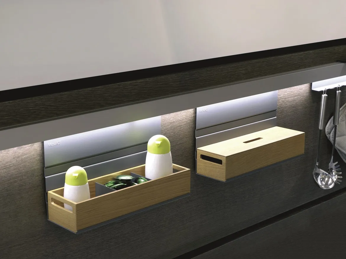 Kräutertöpfchen, Leisten, Messer- + Küchenrollenhalter, Schalen und Ablageborde in verschiedenen Ebenen - auch oben auf der Profilleiste - können nach individuellen Wünschen ins System integriert werden. So haben Sie frische Küchenkräuter, Gewürze, Messer, die Küchenrolle und Handtücher beim Kochen und Backen stets griffbereit zur Hand.
