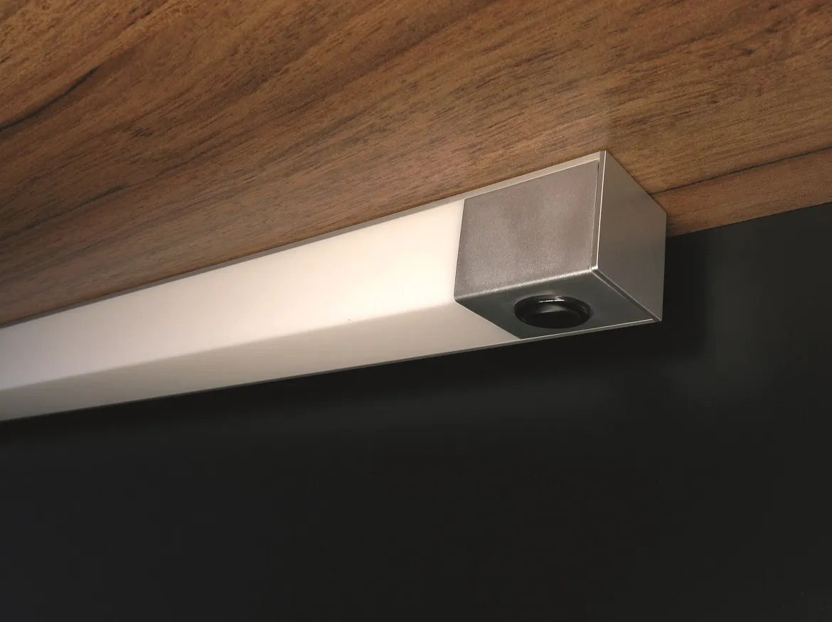LED mit mechanischem Wippschalter. Kompakte Leuchte, die auf Wunsch des Marktes mit einem mechanischen Wippschalter ausgestattet ist - so eignet sie sich als Einzelleuchte oder - einzeln bzw. zu mehreren über einen Converter angeschlossen - auch für Zentralschaltungen (z.B. geschaltete Steckdose). Die satinierte Lichtblende lässt das Licht nach vorn und nach unten zur Arbeitsfläche blendfrei austreten. Die Stromversorgung geschieht außerhalb des Sichtbereiches durch Zuleitung von hinten. Der enthaltene Mini-Kabelkanal ermöglicht Montage in Schrankmitte.