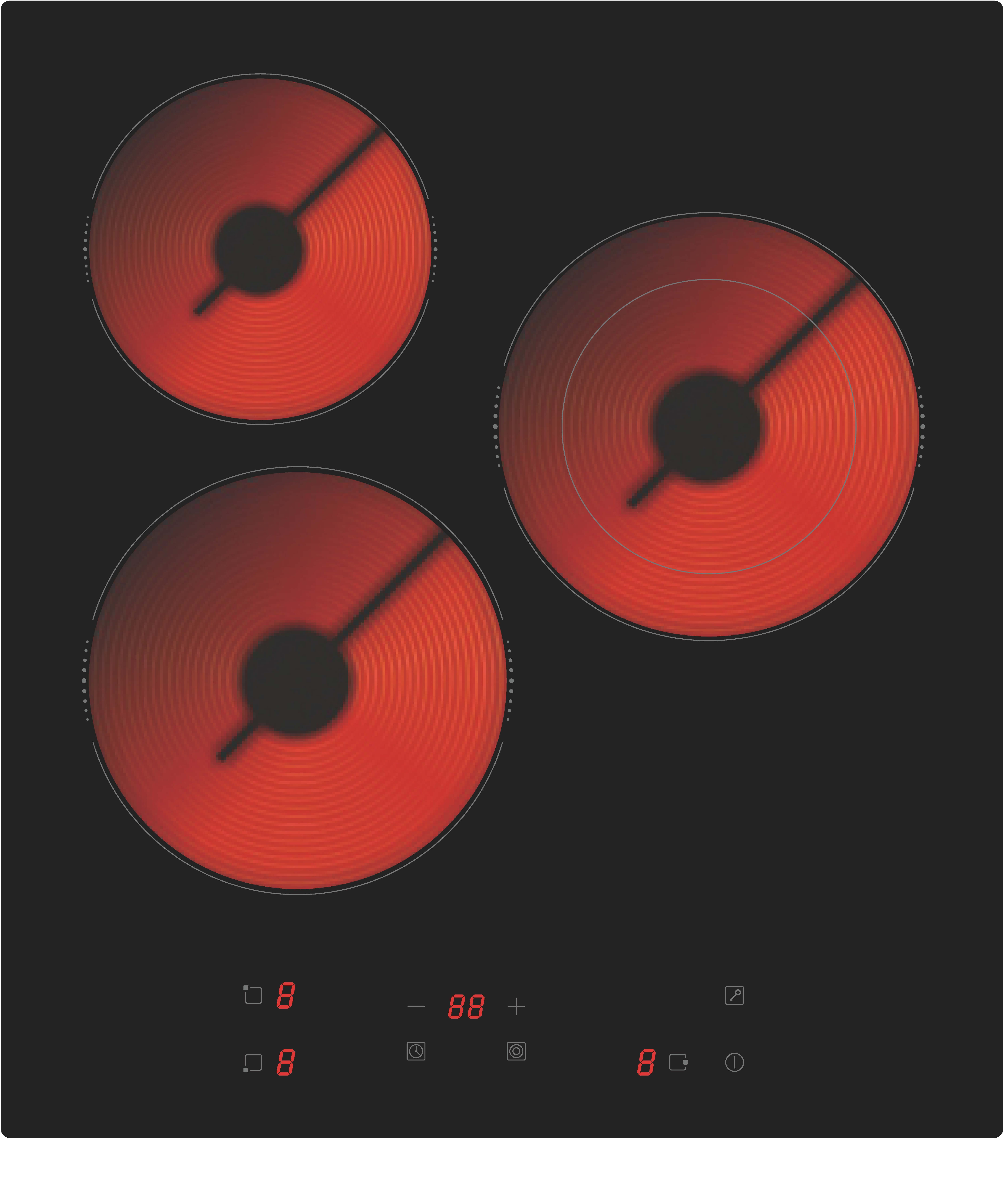 Bedienpanel:Touch Control Material Kochfeld: Glaskeramik Anzahl Kochfelder: 3 Durchmesser Kochfeld vorne links:20,00 cm Durchmesser Kochfeld hinten links:16,50 cm Durchmesser Kochfeld vorne rechts: 20,00 cm Leistung Kochfeld vorne links:1800 Watt Leistung Kochfeld hinten links: 1200 Watt Leistung Kochfeld vorne rechts: 1000 / 1800 Watt Maximale Leistung:5000 Watt Spannung: 220-240 Volt Frequenz :50 Hz