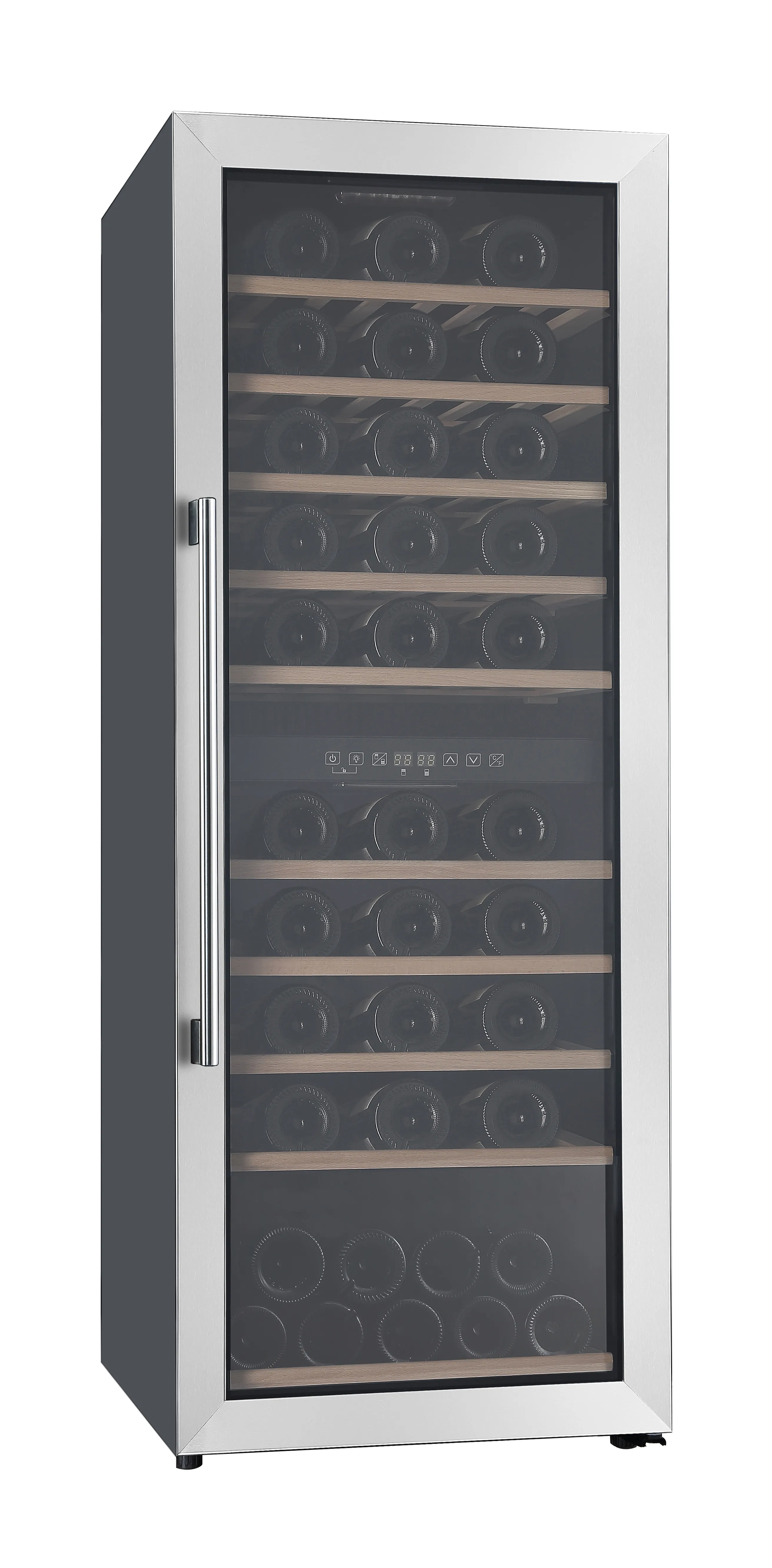 regelbares Thermostat Kompressor 1 wechselbarer Türanschlag externer Griff höhenverstellbare Füße Abtauverfahren Kühlen: Automatisch Beleuchtung im Kühlraum :LED Anzahl Böden: 10 Material Böden: Holz