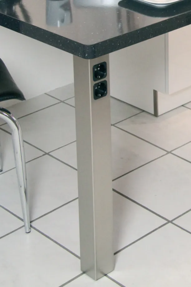 Die eingauten Schutzkontakt-Steckdosen machen diesen Stützfuß in Edelstahl-Optik gebürstet so interessant und vielseitig.